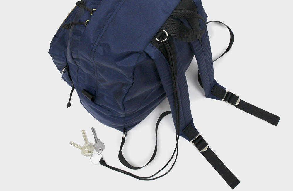 付属のドローコードを使用して鍵などの収納に便利なディテールです。