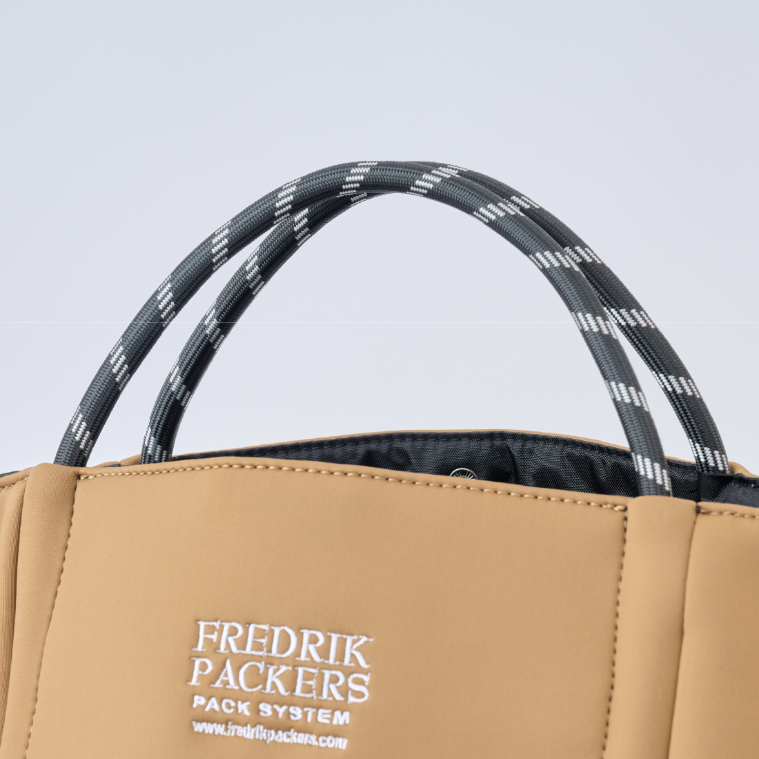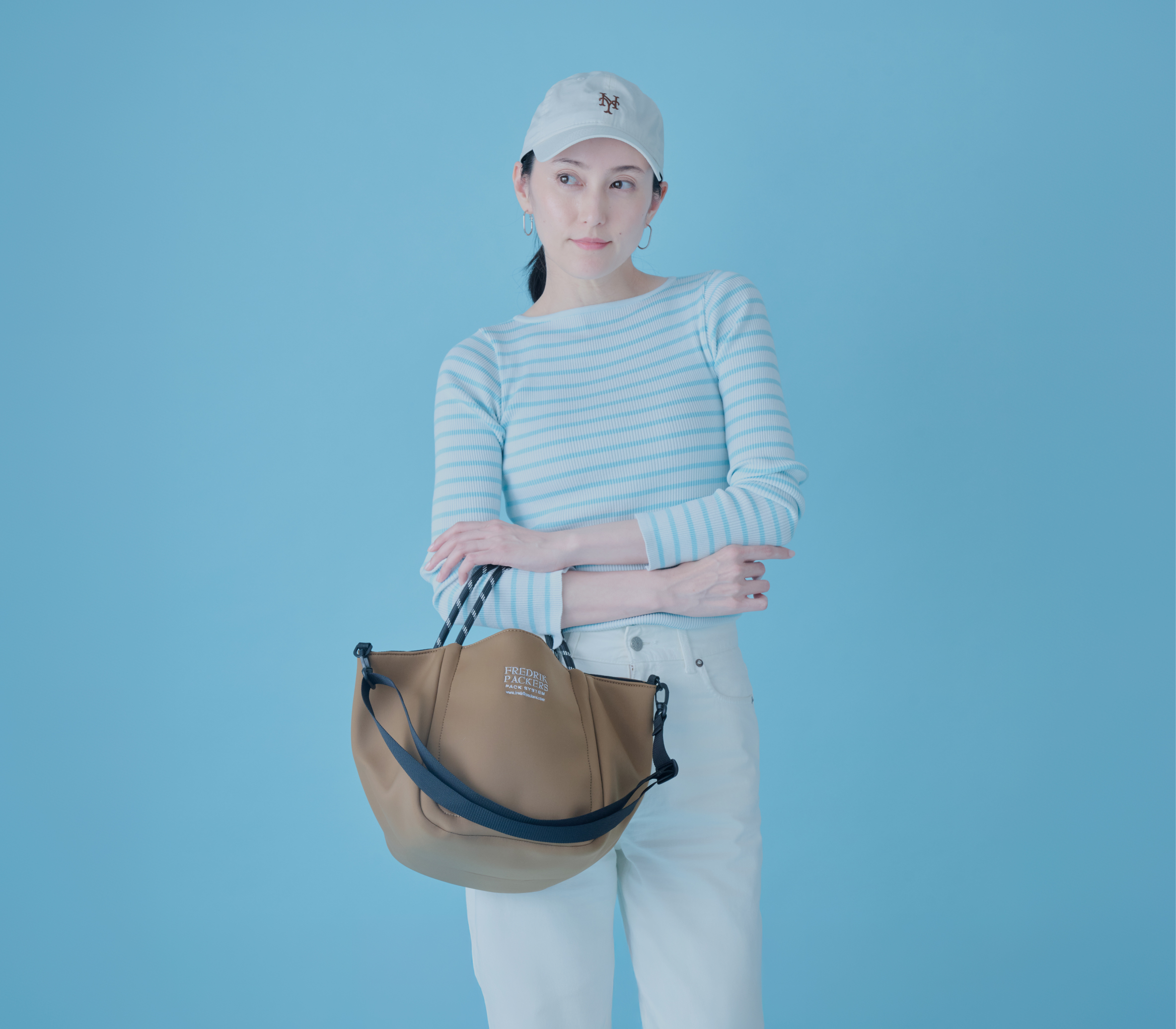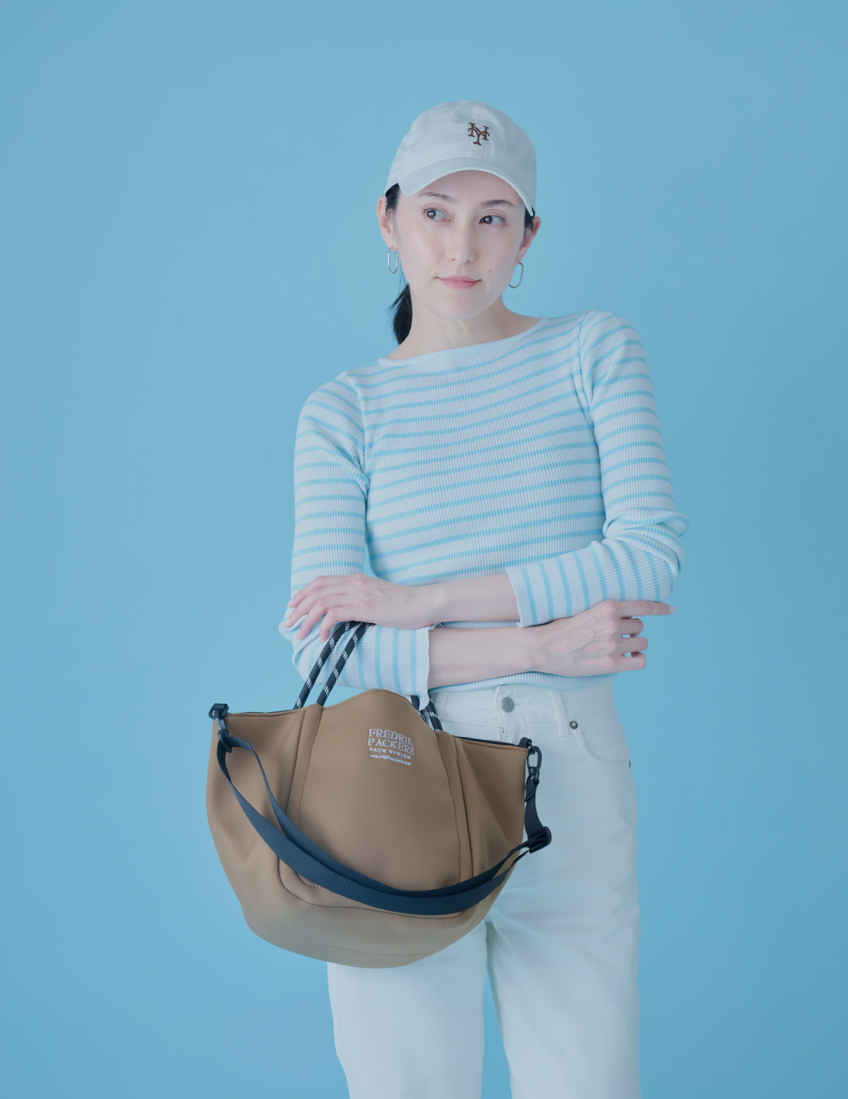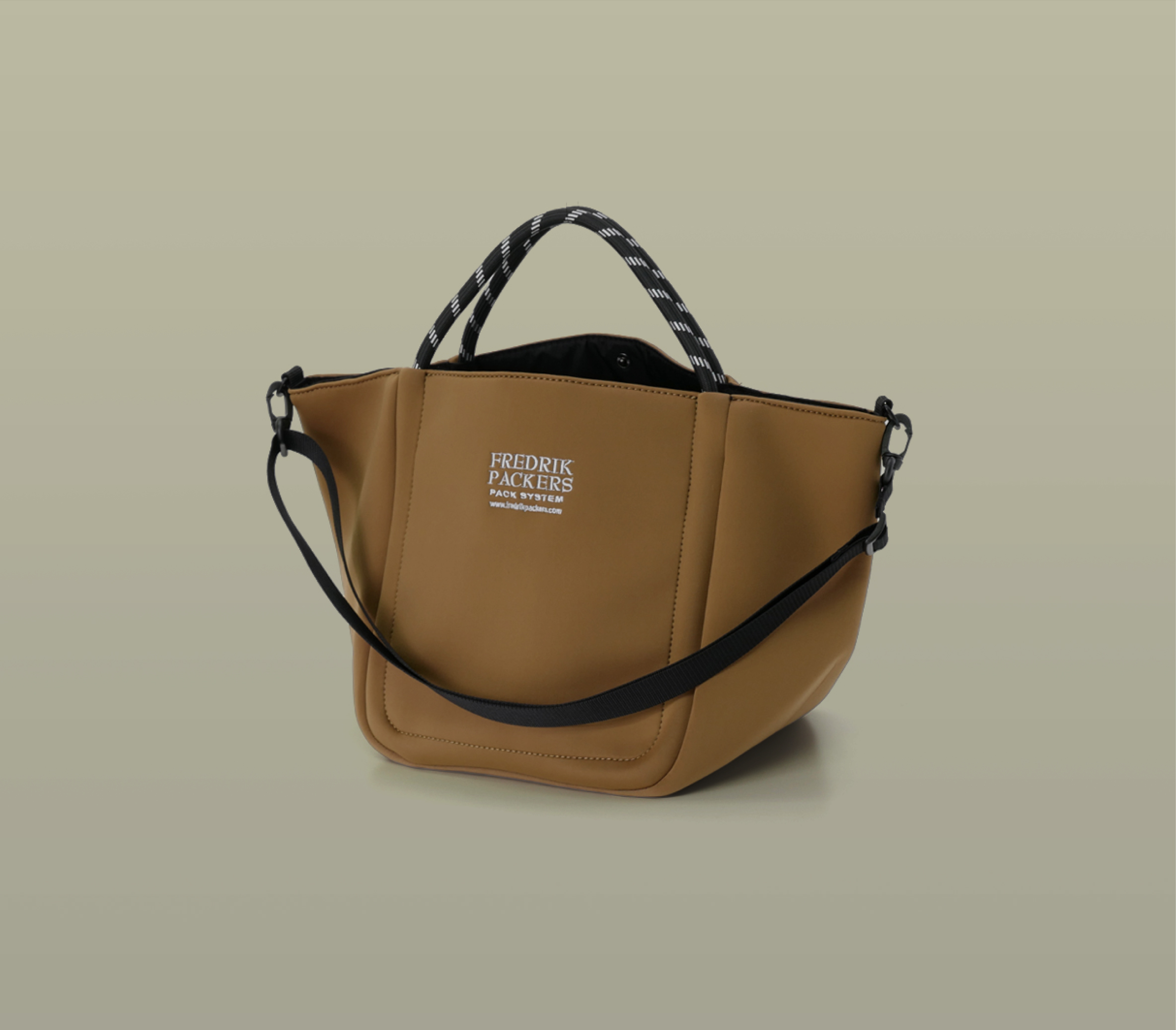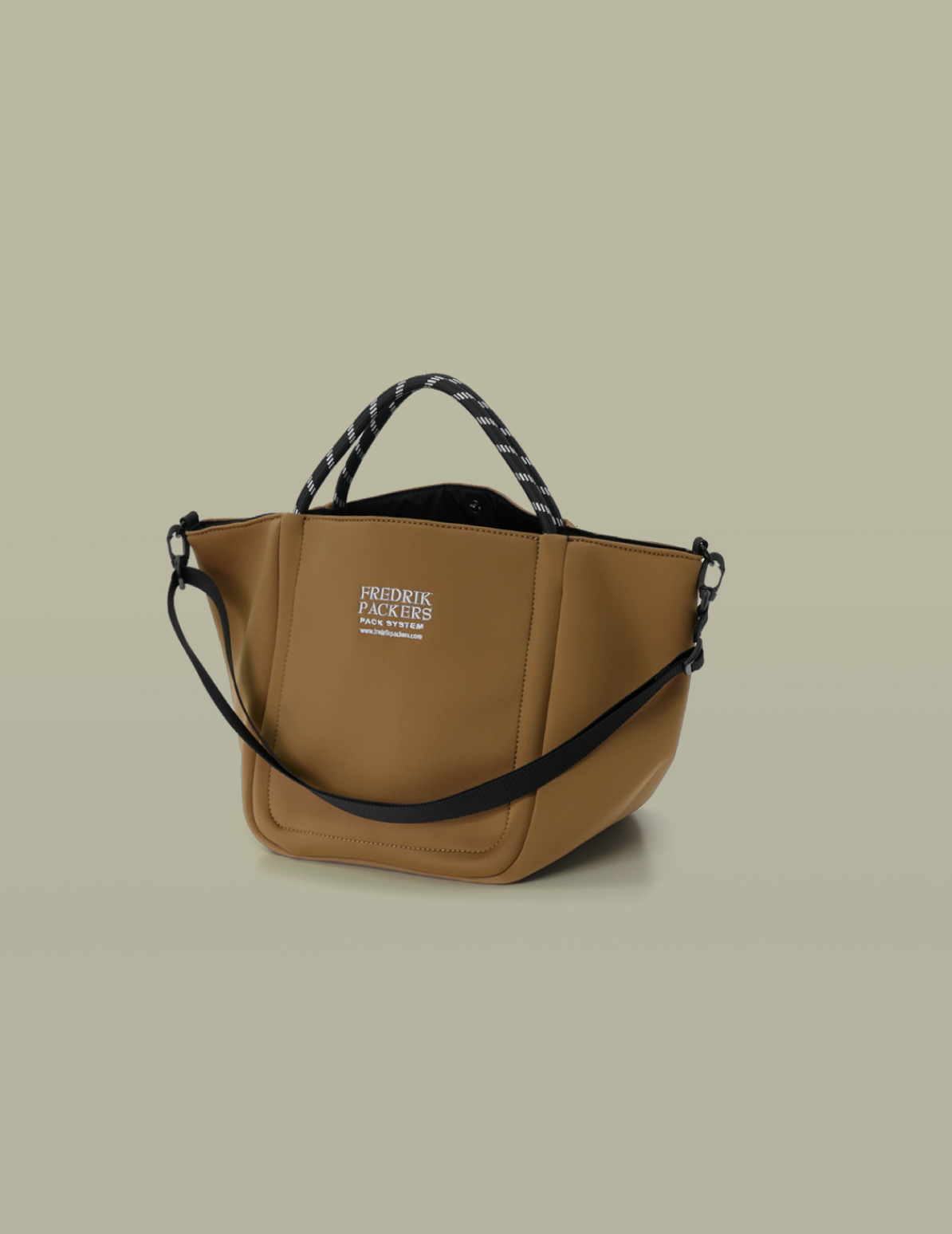 本体前後面の内部に這わせたロープハンドルが芯の役目を果たすことでバッグの形状を保ち、20cmのマチ幅が相まって安定した自立を可能に。