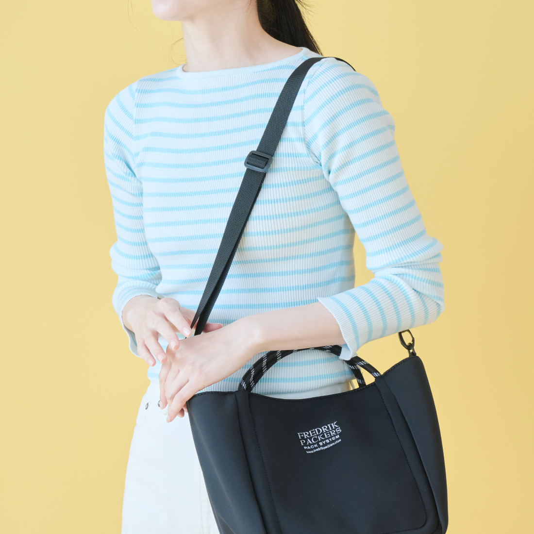 マットな艶感を持つネオプレーンは、光沢が抑えられたしっとりとした質感で落ち着いた雰囲気。レザーバッグに近い感覚で使用できます。サラッとフワッとした感触でソフトな手触りが◯。ブランドロゴはネオプレーン生地に馴染むよう刺繍タイプをチョイス。